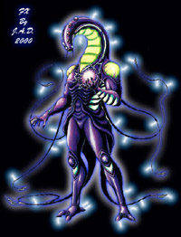 -This type wasn't designed for physical strength, so it only has the equivalent strength of 30 men. Instead, this type was designed to produce up to Two million volts, a total of two Giga Watts of power, of bio-electricity that it could direct on any target within reach of its whip like tendrils. A side affect of this power gave this type the ability to hover in mid air and fly short distances, due to an air ionization effect. -Durability is barely above the norm for a low level zoanoid as this type was never meant to go into battle alone. Instead it was designed to have a symbiotic relationship with the Zektole type, supplimenting the Zektoles power with its bio-energy. -Ground Speed=0-60 MPH / Air Speed=0-10 MPH. -Recent advances in Chronos
