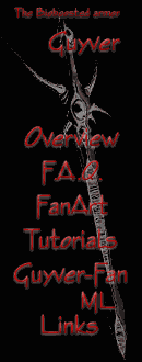 If you've got a question about the series check out the F.A.Q. and if you don't find the answer there feel free to e-mail me. The Fan-art section contains Guyver fan-art (duh..), right now mostly by me ^_^ If you've got some drawings though and want them posted contact me, I am interested in posting any fanworks (art, fics etc.) anyone might be interested in letting me. On a similar note if you're just getting into drawing Guyvers check out the Tutorial(s) I've put together, they might be helpful. Lastly the Links section is the place to go when you're done checking out this site (and are wanting to know more about Guyver), or when I've been either too busy or too lazy to update this section in awhile. |