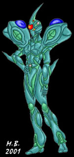 -Physical strength has been approximated to be nearly equal to that of a normal Guyver which possesses the strength of one hundred men. -Stamina is only limited to that of user since the unit possesses a hyper space power link that provides it with limitless energy reserves. -Physical speed is usually limited to that of user with only slight increase in mobility due to the unit's strength enhancements but provides standard flight speed of 300 MPH, which approximates that of a standard Guyver. -Durability is roughly equal to that of a standard Guyver but is augmented by a full body protective energy field that dampens the effectiveness of most attacks, this offsets the units inability to regenerate user from fatale levels of damage, though unit can regenerate host from anything short of an instantly fatale injury and can regenerate itself with as little as 5 percent of its normal mass remaining intact. -Instead of the usual Guyver Control Medal and head beam laser, Aceaer unit possesses a bio-laser orb which exceeds the energy output of a standard Guyvers head beam laser by about twenty five percent in burst mode but is weaker when used continuously by ten percent. -The Aceaers gravitational powers are roughly the same as a standard Guyvers. -The unit possesses a pair of retractable arm mounted plasma swords that approximates the Guyvers vibrational swords by using a highly efficient kinetic energy transfer plasma field instead of vibrational material. The unit also utilizes the same kinetic plasma technology for its sonic weapon emitters which allow it to be used even in the vacuum of space though power levels still only approximate those of a standard Guyvers. -The unit possesses what is generally known as a Rail Gun, an E.M. pulse device that fires small metallic projectiles at near the speed of light, on each forearm and can inflict a considerable amount of damage to any unshielded target. -In place of the Guyver Mega-Smashers, the Aceaer possesses shoulder mounted fusion cannons of nearly equal destructive power but has shorter range due to rapidly expanding nature of blast. Both fusion cannons can also be fired together, at one target, or individually at multiple targets. Also being the Aceaers most powerful weapon that it severely drains the units energy reserves, temporarily weakening units overall power levels, and requires nearly twice the charging time of a standard Guyvers Mega-Smashers. -Unit possesses hyper sensors similar to a standard Guyver but since unit does not directly access the users mind that unit processes the information from sensors and uses it to produce a H.U.D. like display as well as augment the users natural senses to compesate for lack of a direct sensory link to users mind. |