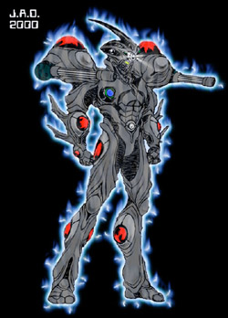 Present estimates of New Guyver type abilities have been compiled and summarized below. -Physical strength varies according to units power levels. Initially this caused subject to average that of a normal Guyver with peak recorded high equal to a Gigantic Guyver when he tapped external energy source(s). The subject has since assimulated a dimensional coupler, allowing him to constantly maintain his maximum power level as long as he doesn't over drain his energy reserves. The subject has also acquired the ability to take on a Gigantic Guyver like form, with its own dimensional coupler, that allows him to easily double his strength and power. -Durability: Units physical composition appears to be a mass of nano-machines that gives the subject approximately the same range of regenerative ability as a normal Guyver but with the augmented ability to absorb surrounding inorganic matter, preferably cybernetic based materials, to accelerate the regeneration process to up ten times normal and is limited only by Units power reserves and available material that can be absorbed but the durability of the armor, in general, is roughly equal to that of a normal Guyver unit, but is further supplimented by subjects E.M. based powers that allow him to create energy shields similar to that used by the Zoalord Prug'stall. Subjects Gigantic form suppliments this even further by generating a secondary shield similar to that used by standard Gigantic Guyvers. Allowing subject to easily withstand a Gigantic Guyvers full double hyper smash for at least one direct hit at a time. -Speed of unit, like most of its abilities, is determined by units power levels at any point in time, but averages that of a normal Guyver with a peak almost rivaling that of the Warrior Guyver unit. Reflex speed on the other hand is vastly superior to any Guyver type due to the computer like Brain subject possesses, allowing Subject to think and react far faster than even a Guyver enhanced human. -Head infrared laser orb and sonic emitters are approximately the same in function and ability as those possessed by standard Guyver units but can be boosted in power level when subject has access to an external energy source, though subject can usually manage to fire these weapons at Gigantic Guyver power levels. In Gigantic form, these weapons are boosted by up to ten times a Guyvers norm and the subject gains two additional head beam orbs, on either side of his control medal, that have half the power of the main orb. -Vibrational Swords are the same as standard Guyver type, but subject has learned to channel his E.M. power through them for added strength and power. In subjects Gigantic form, the vibrational swords can function in the same way as a normal Gigantic and can be infused with enough energy to make them easily able to cut through normal vibrational swords. -Units Mega-Smashers are identical to those possessed by regular Guyver units but due to artificial nature of subjects body that use of the Mega-Smashers results in a severe drain on units energy reserves. This limits the Subjects use of the Mega-Smashers, the most powerful of the Guyvers weapons, to a last resort weapon unless subject has access to a substantial external energy source or has time to regenerate its reserves on its own. This limitation has been greatly reduced since subject assimulated a dimensional coupler but still remains a consideration in its use. In Gigantic form, this weapon is more than doubled in power and when subject can tap a large source of external power, he can fire a blast as powerful as a Destroyer Grakkens full quadruple hyper smash, but with a firing duration of up to 10 seconds. The downside to this powerful attack is the enormous energies needed to empower the subjects hyper smashers to that level of power can overload and destroy the subjects body, so is rarely used unless absolutely necessary. -Electro Magnetic Control Orb: The normal Guyver ability to control gravitational forces has been replaced with the ability to generate and control complex electro-magnetic fields that allow Subject to fly and create force fields, effectiveness varies according to Subjects power level but can withstand anything up to a Guyvers Mega Smashers when Subject is linked to an external energy source or is fully charged by the dimensional couple. Subject can also focus its power to produce a variety of energy weapon attacks. One type of attack generates a directional shockwaves of E.M. energy, with a one to six foot radius, though damage index varies with units power levels, and can easily rival the pressure cannon in force and destructive radius. It can be fired continuously. The subject can also focus his power to produce a pressure cannon like plasma ball attack, with the destructive power equal to a Gigantic Guyvers normal blast. This attack can also cause secondary damage to targets vulnerable to the intense heat and electrical discharge of this attack, unit can also fire lightning like bolts from hands with similar to higher damage index as the electrical discharge from a Hyper Zoanoid Elegon, depending on units power levels, but does not require physical contact and can reach targets as far as 100 meters away, and just below the units vibrational swords are plasma pulse blast emitters that can rapidly fire a short intense plasma energy pulse with a damage index equivalent to a Guyvers single handed mini-pressure cannon blast but induces the damage from intense heat rather than force. In Gigantic form, all these energy attacks can be triple in power or focused into a single massive plasma ball blast, twenty times more powerful than a normal Guyvers pressure cannon. -Unit can use nano-tech nature of its body to morph either or both of its forearms into fusion cannons. Though a short range weapon the fusion cannon has a damage index of roughly half of the units Mega Smashers but can be used repeatedly due to lesser strain on units energy reserves. In Gigantic