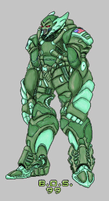 -Physical strength has been approximated to be equivalent to that of thirty men, which makes it twice as strong as the Gregole Class Zoanoid. -Speed: The Green Type V1 provides the wearer with the full range of movement and mobility as they would normally have unarmoured as well as enhancements due to the built in jets that allows unit hovercraft level mobility up to 160 MPH and with the ability to jump over obstacles as high as forty feet. -Durability levels are highest yet for US armor types. An evolutionary step forward from the Blue type, the Green armor utilizes similar composite armor as the Blue type but adds an energy shield system similar to that used by the Robo Guyver armor types, before they had been discontinued. Though not as powerful, the shield system improves armor durability to a level that can withstand a Vamore bio-laser blast with minimal surface damage. -Sensory perception: Armor is equipped with the latest H.U.D. tactical display, providing auditory and visual enhancers that respond automatically to changing combat situations. -Weapons: The Green Type Battle Armor can be equipped with a variety of weapons including arm mounted electric guns that fires 20 mm H.E. caseless armor piercing rounds, short range guided mini-missile shoulder mounted pods (optional, depending on mission specifics), jack hammer armor piercing wrist mounted spike for close range combat (Concealed within gauntlet when not in use), and laser targeting system that is of sufficient power to blind the average Zoanoid, but unlike older versions of human Battle Armor, the Green Type V1 is designed to be upgradeable and easy to equip weapon add-ons can give the armor a variety of different mission specific capabilities when needed. -Other abilities and tools can be added depending on the combat situation the unit will be put in. -Armor is powered by a dimensional coupler device similar to those first used in the Robo Guyver armor series and provides armor with an unlimited reserve of energy in a manner similar to the Warrior Guyvers HSL, by tapping higher energy filled dimensions. |