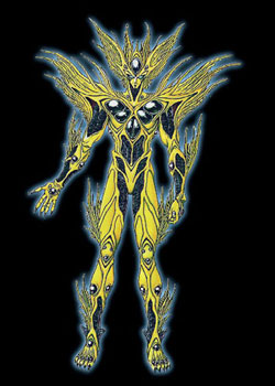 Present estimates of subjects abilities have been compiled and summarized below. -Physical strength ranges from that of 400 men in his human form to 3000 men in his full Bio-Boosted Battle form. Stamina is nearly unlimited due to a HSL type power system derived from the Bio-armor developed from the Warrior Guyver technology acquired by Chronos but is inferior to the the Warrior Guyvers. This causes the subject to deplete his bio-energy reserves if he uses his full power for too long but quickly recovers once he rests. -Speed is hard to estimate as subject usually just teleports to where ever he wishes to go and can fly in all his forms, but the maximum observed running speed is around 10,000 MPH and maximum observed flying speed is around 60,000 MPH. -Durability: Subject, as a master zoalord, possesses enormous raw power, even in his human form and has been observed to withstand anything up to a zoalord black hole attack in his human form. In his Full battle form, he has a Warrior Guyver type body shield that combined with the Bio-Boost armor and his Zoalord body armor, allows him to withstand anything up to a single Hyper Smash from a Gigantic Guyver. Though this durability is rarely tested as he can simply warp most attacks around himself, this ability combined with standard type Zoalord shield, a Warrior Guyver type Blast shield, allow him to withstand anything up to a 50 Mega Ton attack nuclear attack. Use of subjects Ultimate attack can allow him to withstand anything up to the power of his ultimate attack. -Subject doesn't have Guyver type Mega Smashers but an unexpected enhancement from the bio booster armor has instead created a zoacrystal hyper smasher that allows subject to focus his vast powers into a single blast with up to 30 times the power of a normal Gigantic Guyvers full double Hyper Smash. -The head Laser Orb is merged with a Zoacrystal and produces a highly effecient bio-energy/laser beam blast that has exhibited an energy output nearly thirty times greater than that of a normal Guyver. -The Subject possesses all the Gravitational powers of a Zoalord and Guyver combined. Allowing him to fire pressure cannon blasts ten times the power of a normal Guyvers, or roughly equal to the power of a full single Mega Smash from a Guyver, and just as easily fire multiple black hole attacks. The subject can also focus this power, along with his psionic powers, to warp the fabric of reality for a variety of effects. -The units possesses Vibrational swords similar to the Warrior Guyvers. -Subject does not have Guyver type hyper sensors but his immense physical and mental powers allow him to have a near god like awareness of his environment, for a radius up to 50 miles. -The subjects main Zoacrystal has been enhanced to give it Control Metal type abilities that combined with other Control elements throughout his body, and the full restoration of his body has restored Lord Alkanphel to his full power. The bio-armor unit bonded to him even has its own Warrior Guyver type control medal, but the unit does little to nothing to bio-boost the subject, but does provide him a HSL based power system that helps ensure he can use anything short of his full power without worry of using up his bio-energy reserves. The Unit also provides subject with vibrational swords, transforms his chest crystals into a Mega Smash type beam weapon, and provides him with Guyver level regenerative abilities. -Subject also possesses all the other powers of a master zoalord like the ability to teleport at will and to use the psionic based cyclone attack but at a significantly higher power level than any other Master Zoalord. -Ultimate Weapon: Subject can