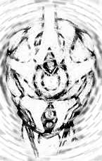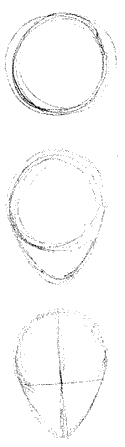 Next, whenever drawing something with any semblance of a face try and draw guides. <= here I've cut the egg shape in half twice (once verticaly and once horizontally), be careful not to make the top half shorter than the bottom and try and make the two halves semetrical. If there's one thing that's good to remember when drawing head on pics it's to keep things as symetrical as possible. |