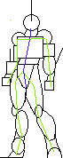 in any order but here's how I usually assemble this guy: First off I draw in a sort of line of balance, usually more or less where the spine runs through (shown in blue). This is what everything else is built on. Off of the spine I draw a loose skeleton (It's really just a stick figure, shown in green). You might want to note that this isn't the same sort of stick figure you would use for drawing, say a normal person. It's especially evident in the legs where to an extent the legs seem to arch backwards. No that's not a mistake. |